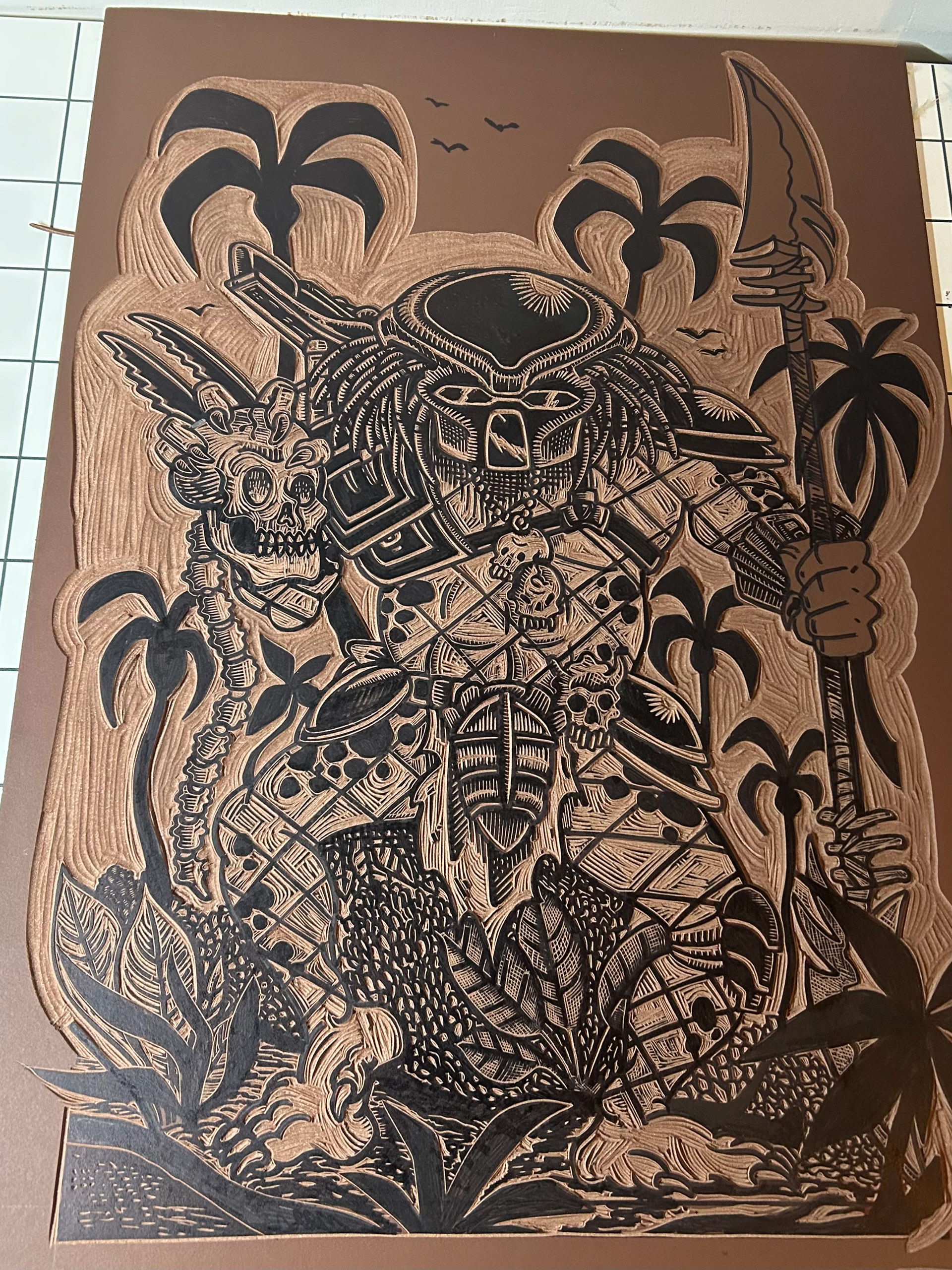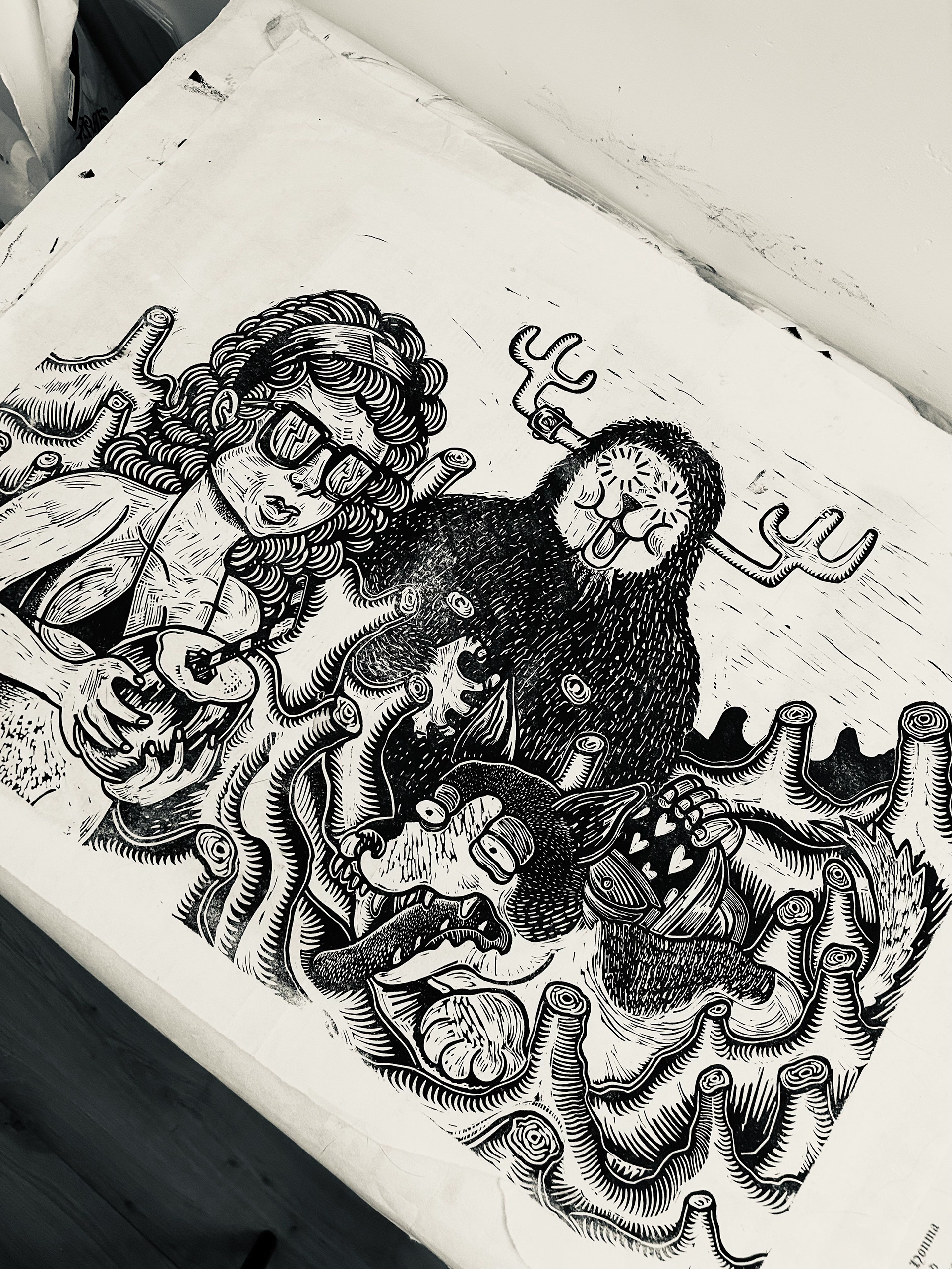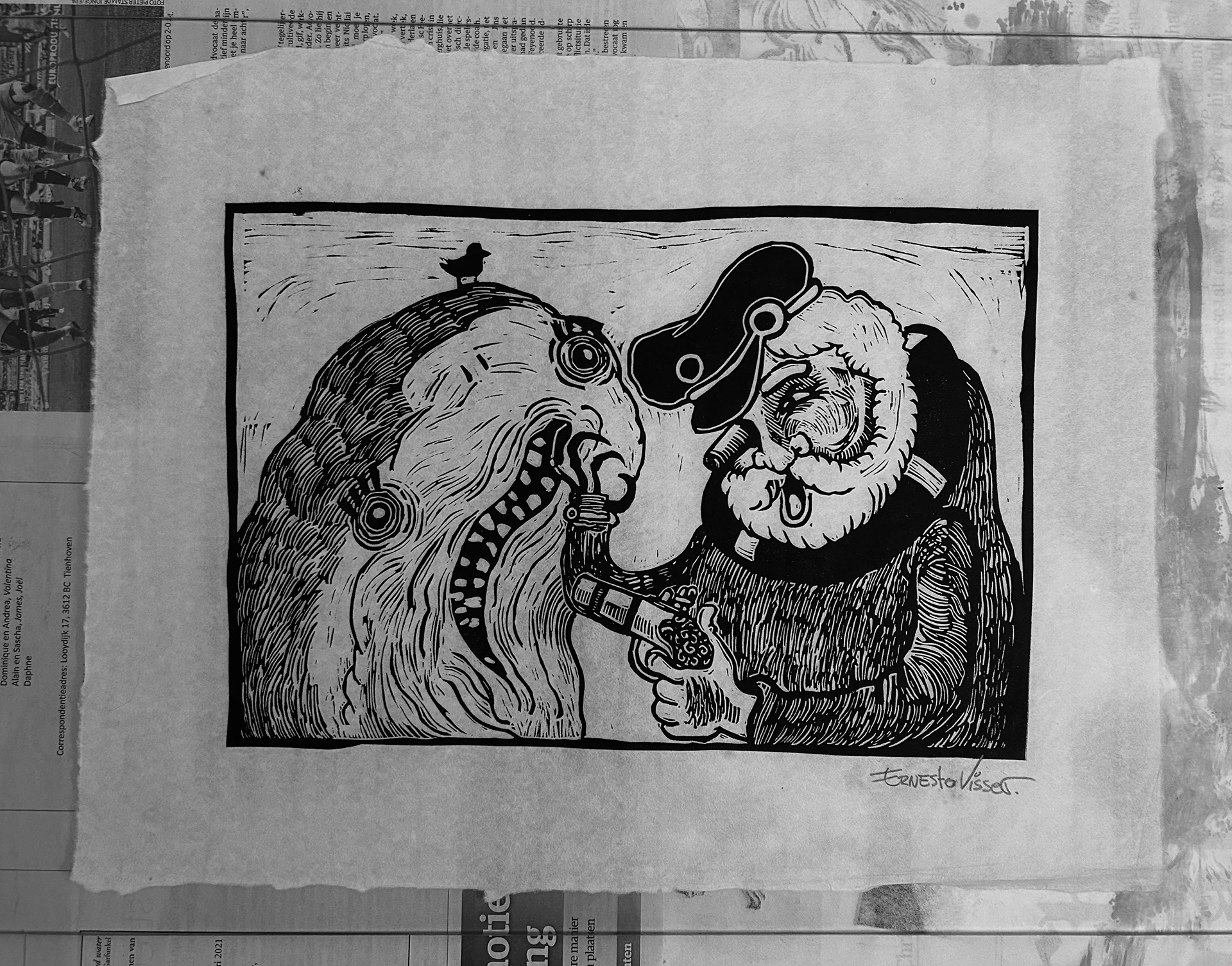 Ernesto Visser (1988, Angra dos Reis, Brazil) is a Brazilian-Dutch visual artist, tattooer, and experimental musician based in the Netherlands. Graduated at the Fine Art School of the Universidade Federal do Rio de Janeiro as a printmaker, his work merges classical engraving, comic aesthetics, and pop culture.