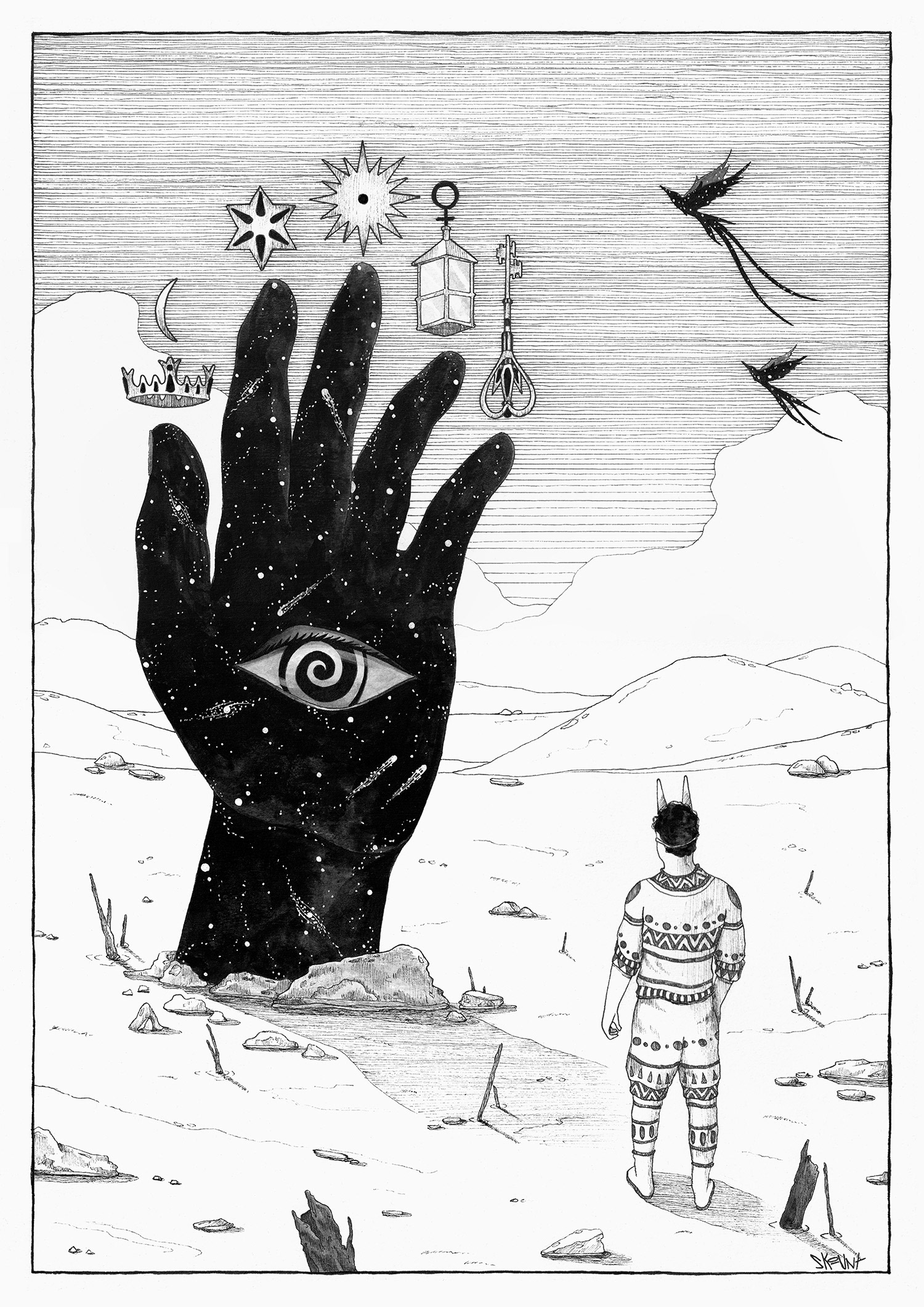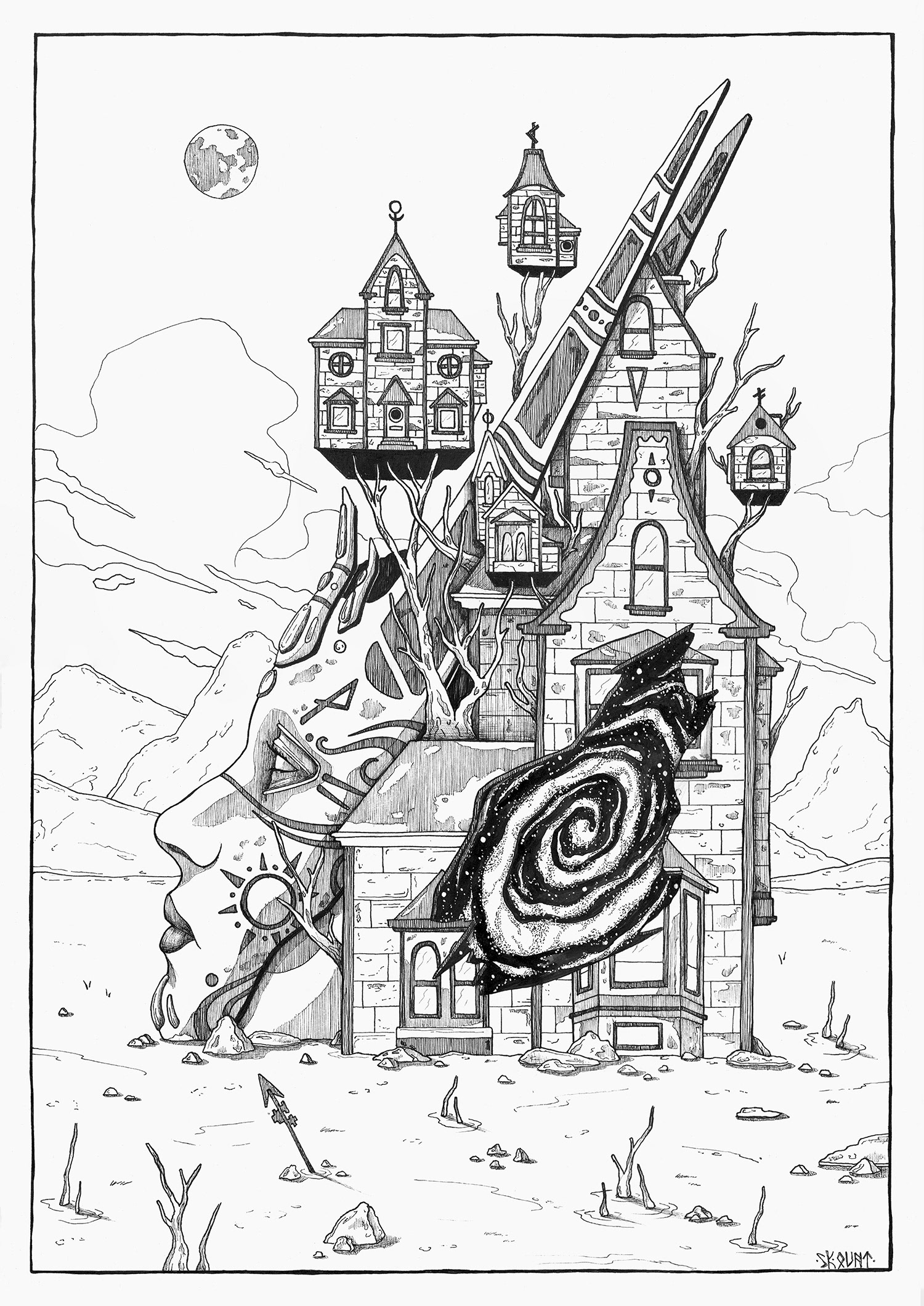 Skount Biography Skount is a Spanish visual artist whose work explores the introspective and unconscious dimensions of the human psyche. Internationally recognized for his enigmatic masked figures and intricately detailed compositions, his practice moves fluidly between imagination, symbolism, and emotional introspection. Born in Cádiz (Spain) and currently based in Amsterdam, Skount’s artistic voice has been shaped by extensive travels and encounters with diverse cultures, traditions, and mythologies.