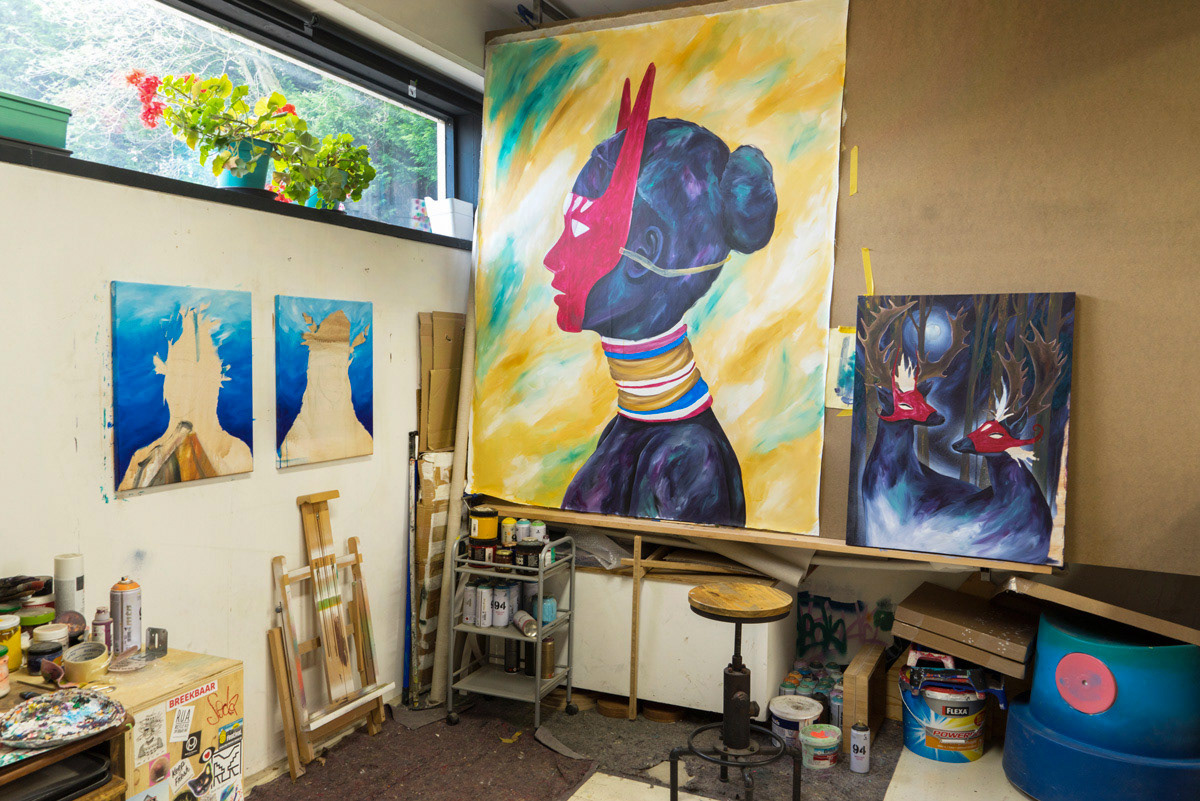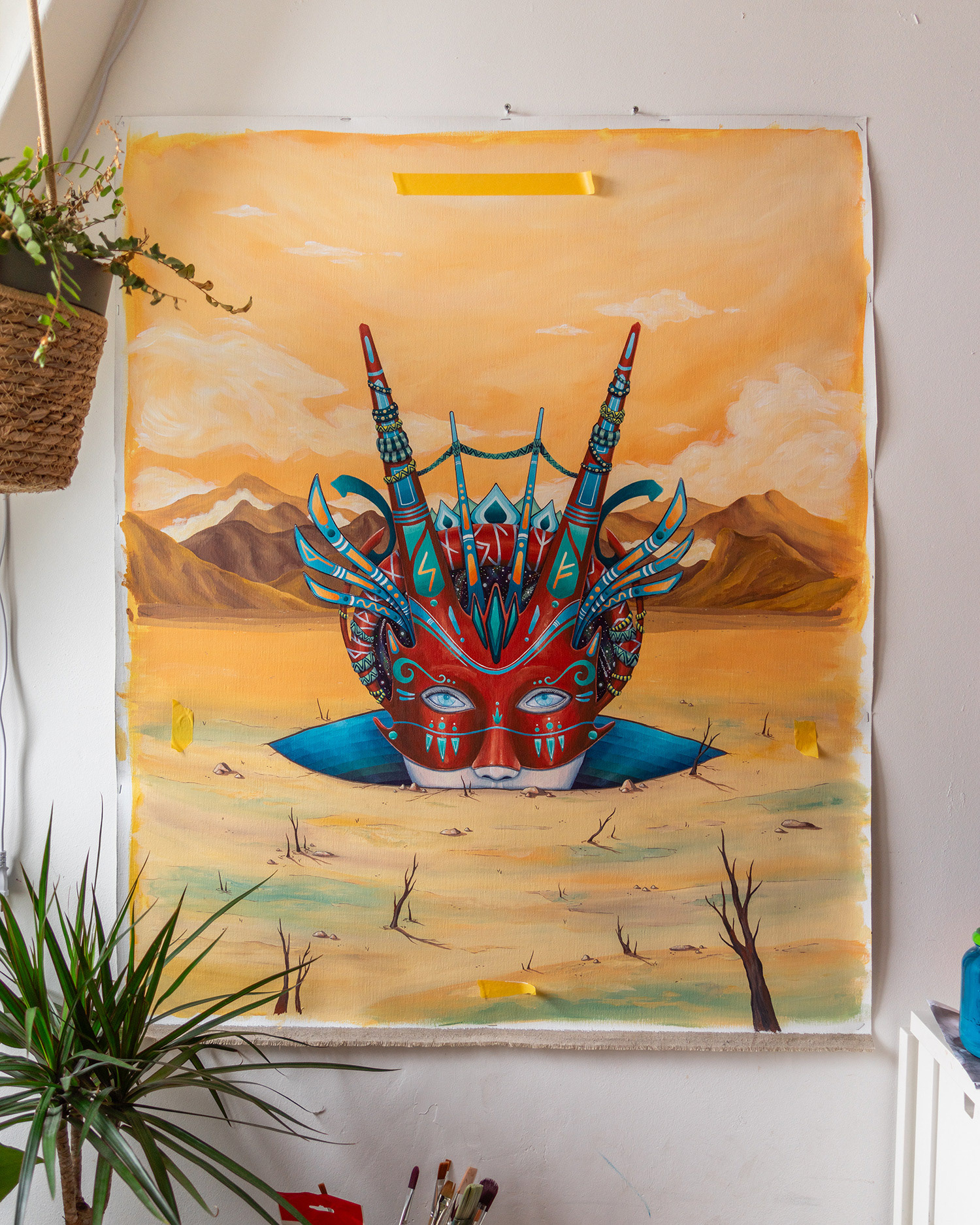 Regardless of the medium: painting, murals, sculpture, or installation, my intention remains to create portals into inner worlds: spaces where the boundaries between reality, dreams, and memory dissolve, allowing room for transformation. Ultimately, my work is not solely about what is seen, but what is felt. It is an invitation to pause, reflect, and reconnect with the hidden parts of ourselves. Symbolism & Influences Rooted in a broad spectrum of mythologies, esoteric teachings, ancestral rituals, and spiritual philosophies, my work weaves together symbolic languages from many cultures. Drawing from surreal imagery, esoteric symbols, sacred keys, spiritualism, and cosmic elements, these influences materialize in masked characters, geometric patterns, and emotionally charged, dreamlike atmospheres. Each piece becomes a transcendent space where ancient symbols and profound meanings meet contemporary identity and consciousness.